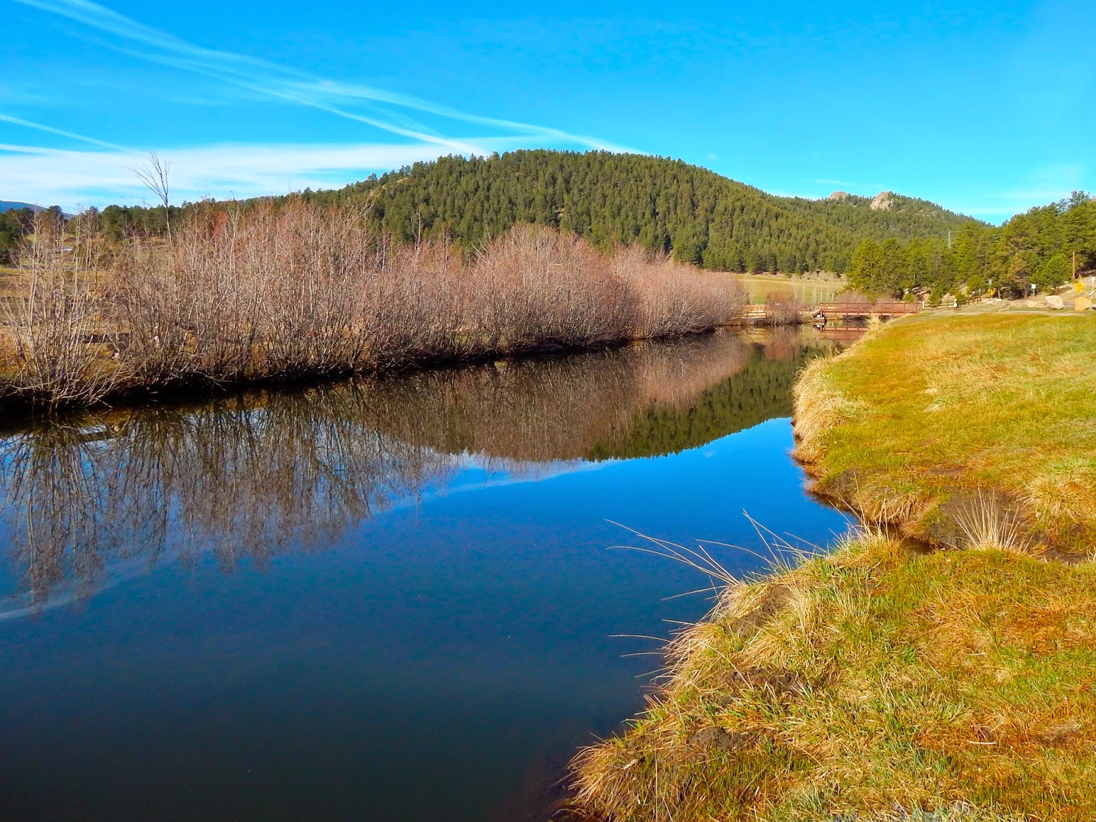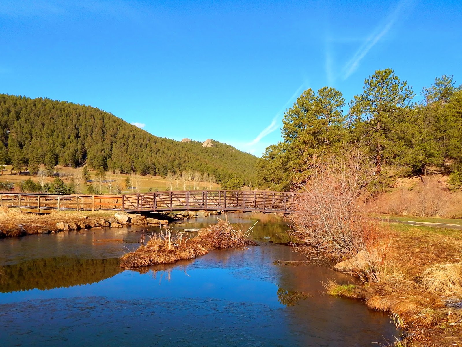 “Put one foot in front of the other and soon you’ll be walking cross the floor. Put one foot in front of the other and soon you’ll be walking out the door.” ~ Kris Kringle to the Winter Warlock It’s spring, time for a fresh start or a new beginning. It’s like learning to walk all over again. I attempted to circumnavigate Evergreen’s jewel of shining sapphire on a frosty April morning. After a two week confinement, the fresh air in weakened lungs and soft dirt beneath shaky legs felt good. In the beginning, steps were short and cautious. Filled with confidence, the search for strength was gratefully discovered. The bright, morning sun radiated warmth and quickly melted the dusting of sparkling snow. It was an unusual arrangement, peace and quiet during a busy workday. I could get used to that. Frozen glaciers in the high peaks had not released their winter reserves so the creek was running low and the dam barely overflowed. The lake was thawed and birds were bustling with activity. The red-wings were first, nesting in the cattails. Mallard pairs drifted along the shore and robins were the early birds searching for worms on the grassy bank. A cobalt sky and dark trees were reflected in the glassy water while the arched bridges were elegant connections during the circuitous route. Back at the start, things looked different. Colors were brighter, air was fresher and sounds were clearer. Maybe they were right. Sometimes we have to come full circle to find the truth.